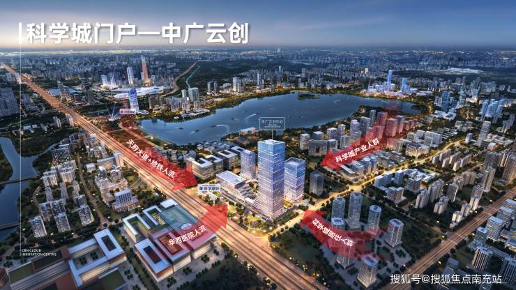 中广云创项目,位于都邑中轴天府大道旁+地铁1号线科学城站上盖物业,是科学城的交通流派及气象地标。科学城物业人群、寓居人群、华西就医人群、兴隆湖旅逛百万人潮集聚于此公寓酒店。