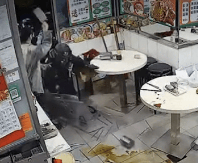 现场视频显示,事发餐厅内,餐具掉落,桌面凌乱,一名女子站正在餐厅内,手持菜刀指向门外,捕快持盾牌破门而入,该女子手持菜刀袭击捕快头部,并试图掠夺盾牌,随后被捕快栈稔。